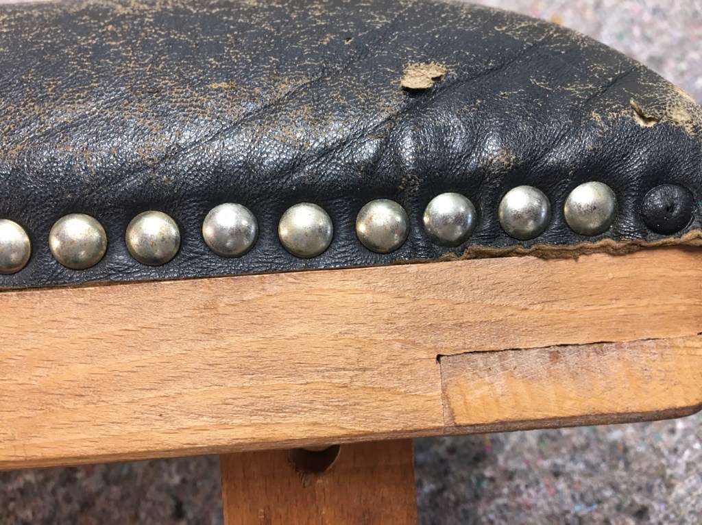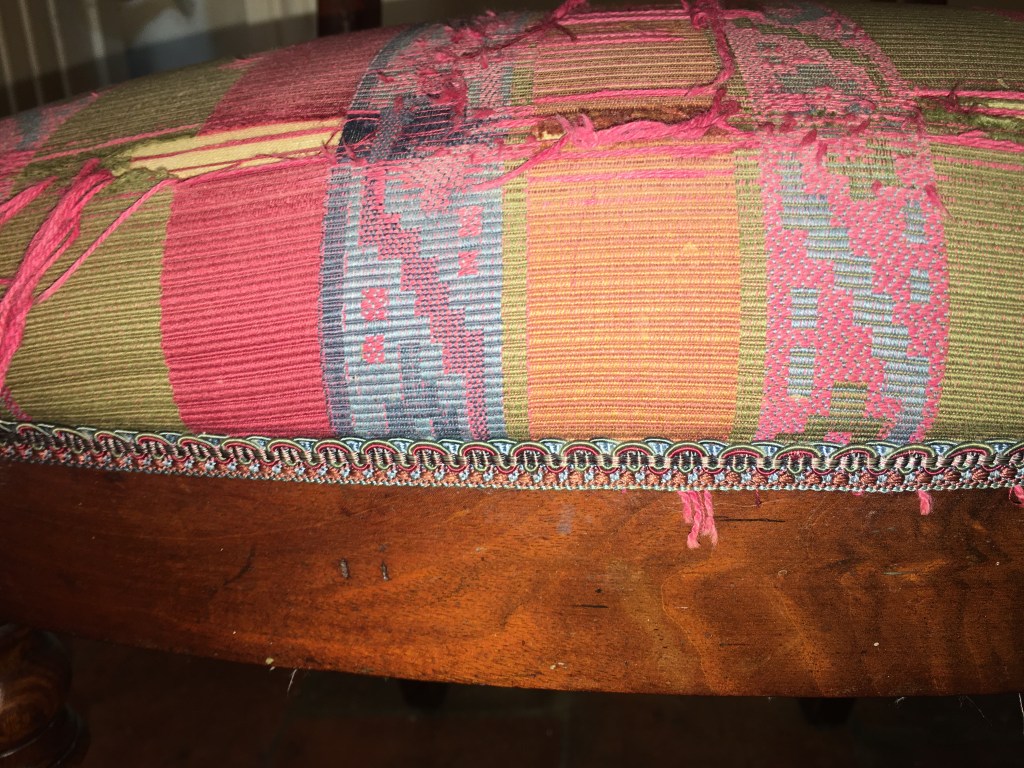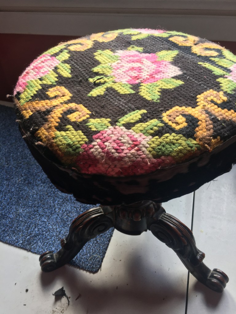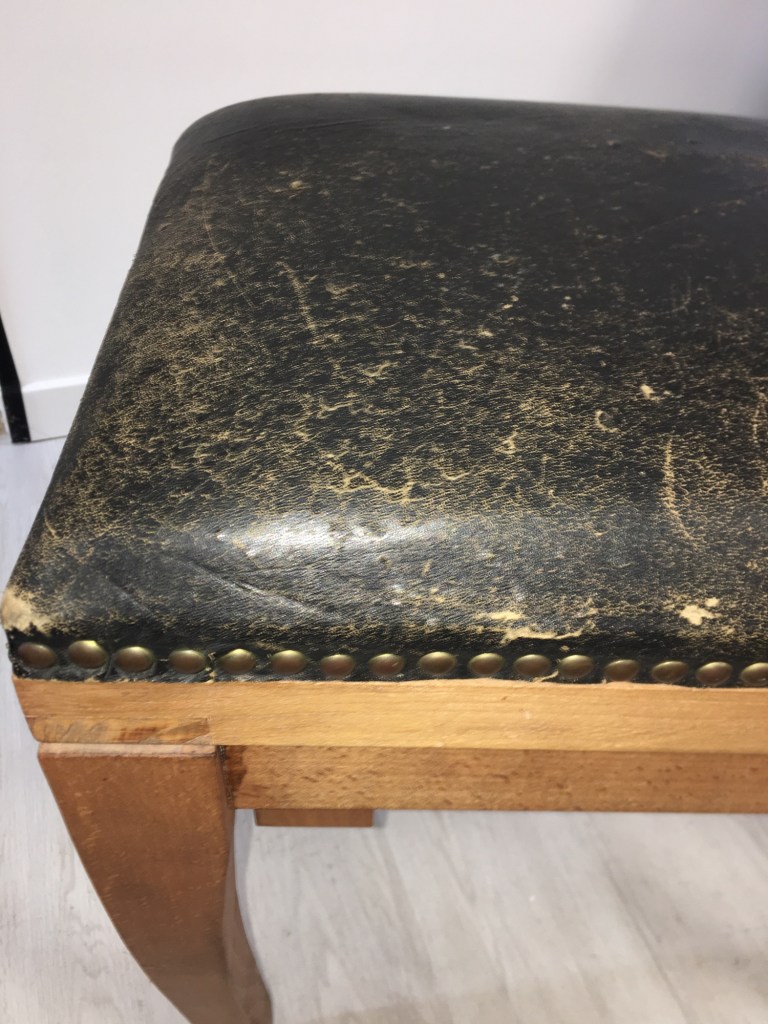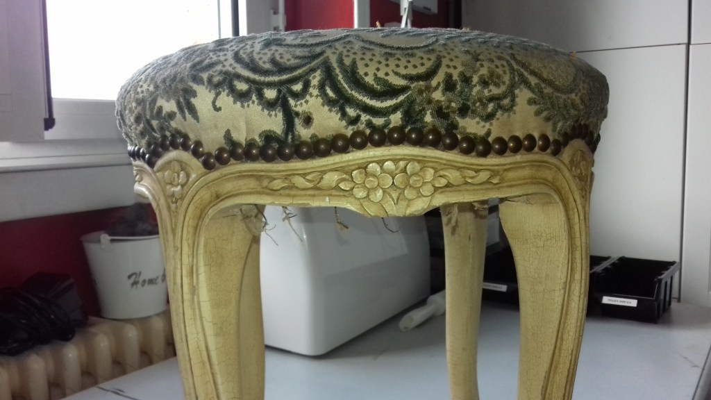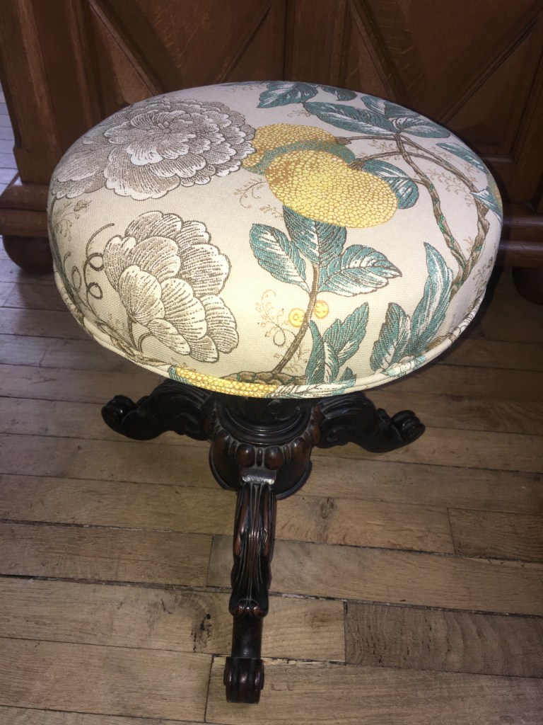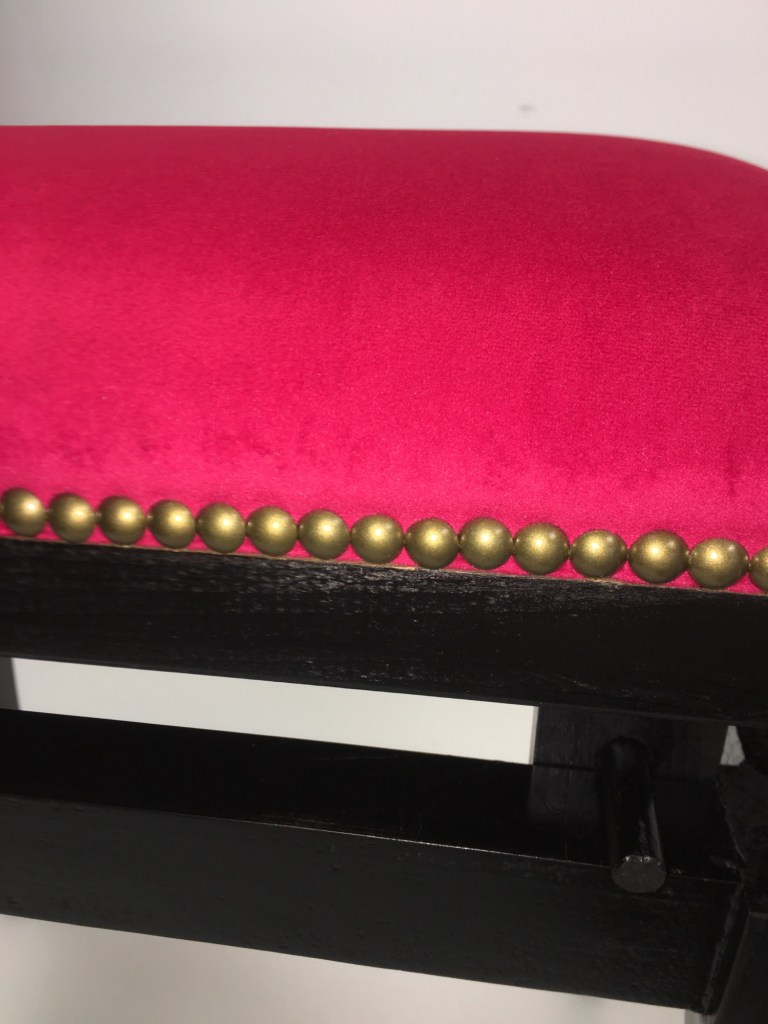Recouvrage et finition clous tapissiers pour ce tabouret de piano.