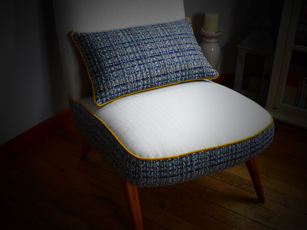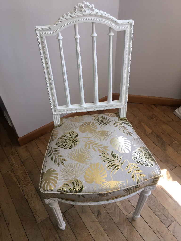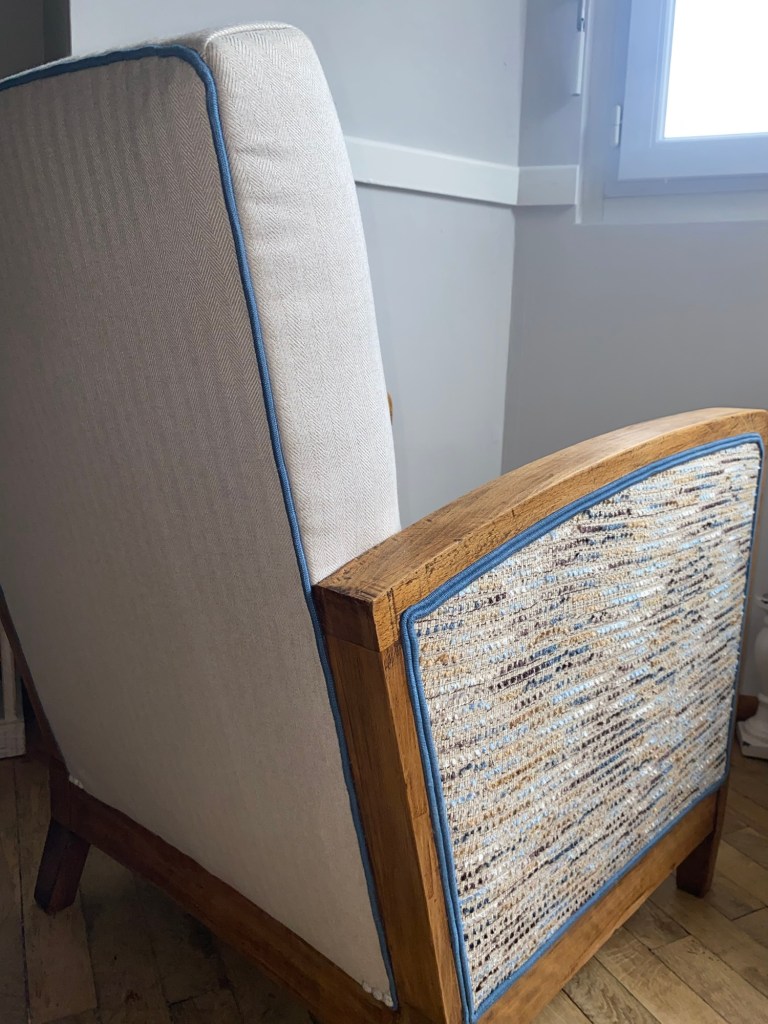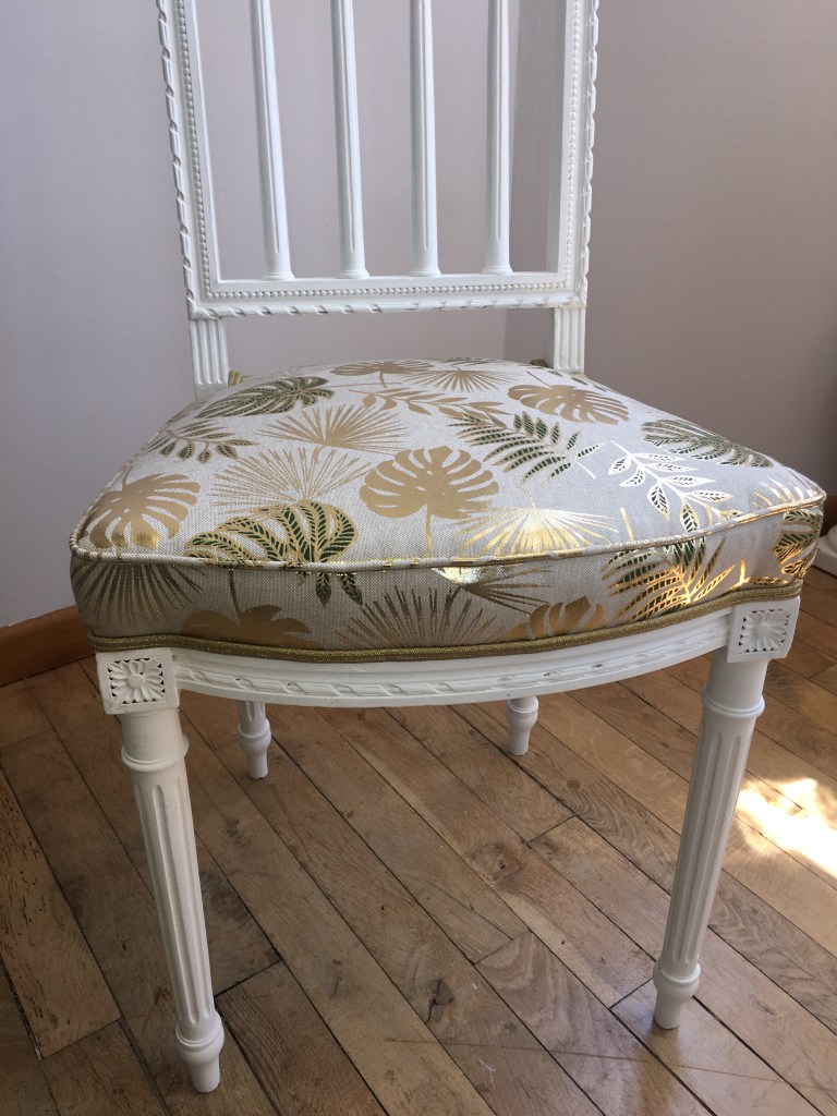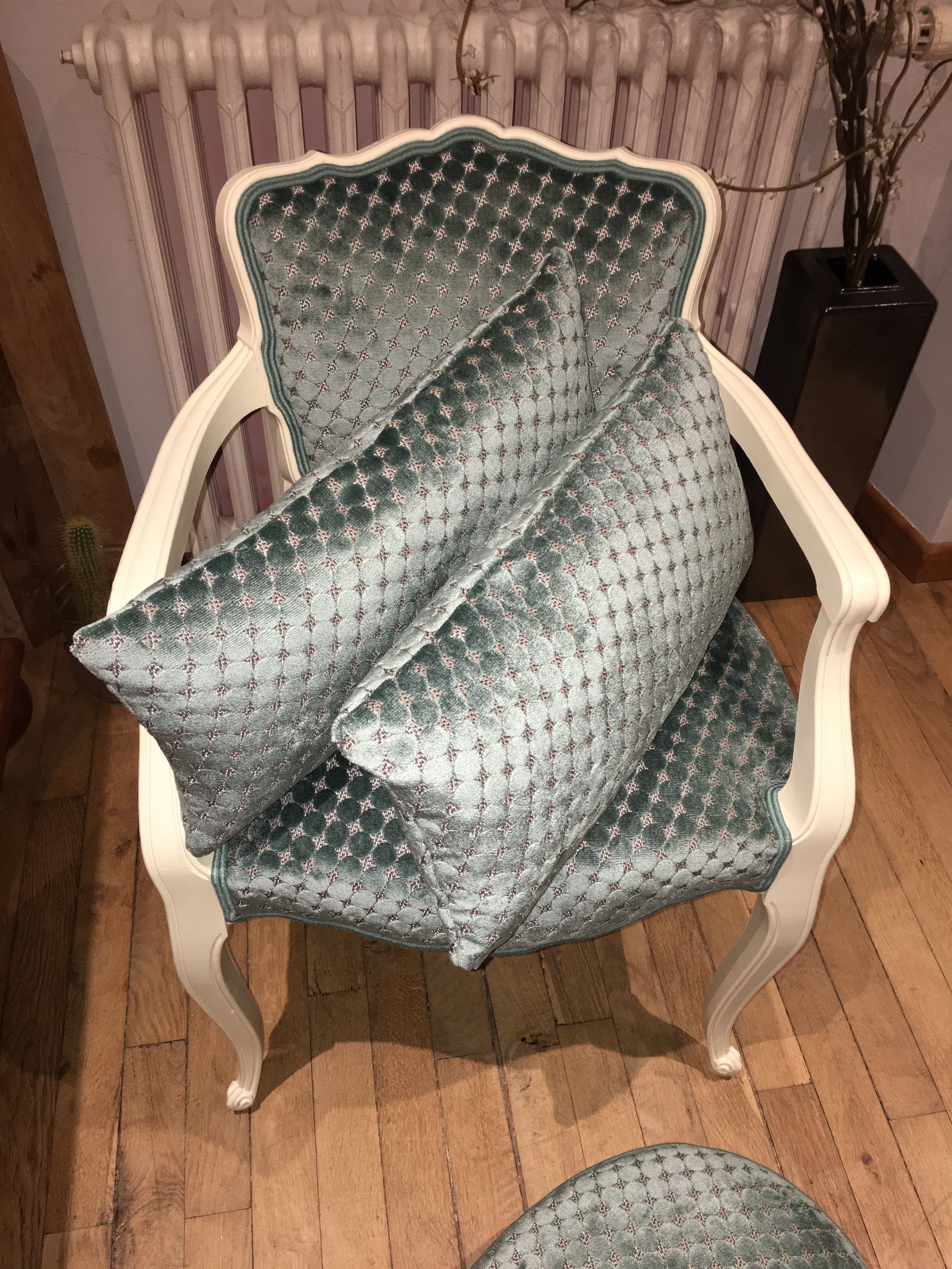 Recouvrage fauteuil cabriolet et repose-pieds, confection de 2 coussins (plumes et kapok) et de 2 housses de coussins à fermeture.Création de toiles de jute personnalisées pour la réalisation manuelle d’un cache radiateur (radiateur en fonte).Changement simili cuir sur des chaises de cuisine.Changement de tissu pour ces deux chaises de style tâchées.Recouvrage d’une chaise.Recouvrage d’un ensemble de 6 chaises (assises, dossiers et dos) en simili cuir bleu et finition dans le simili cuir bleu.Création d’un coussin pour une banquette en bois : en toile de jute à chevrons personnalisée et tissu en velours noir aspect cuir.Recouvrage chaises, tissu fourni par le client et crête Annecy (Les Passementeries de l’Île de France).Reprise recouvrage fauteuil voltaire avec tissu et finition fournis par le client.Restauration assises de chaises en simili cuir.Nouvelle couverture pour ce coussin d’assise. Tissu ivoire à chevrons ton sur ton et bouton recouvert d’un simili cuir camel.Restauration assises de chaises en simili cuir.Réfection tabouret de piano, finition double passepoil avec le tissu fourni.Réfection de 2 cabriolets Louis XV.Restauration fauteuil Voltaire et tabouret de piano avec tissu fourni par le client.Chauffeuse vintage.Fauteuil des années 30.Cabriolet Louis XV avec toile de jute personnalisée.Fauteuil Voltaire.Fauteuils bridge et pouf carré réalisés à partir de carcasses neuves.