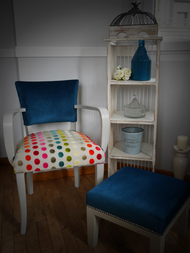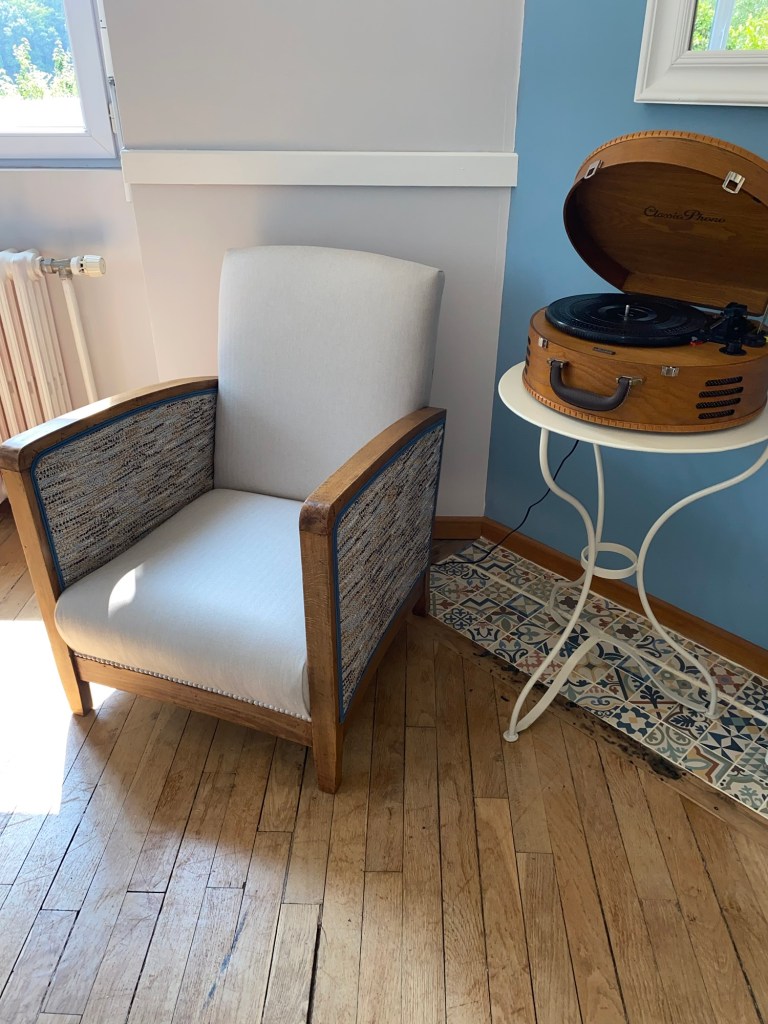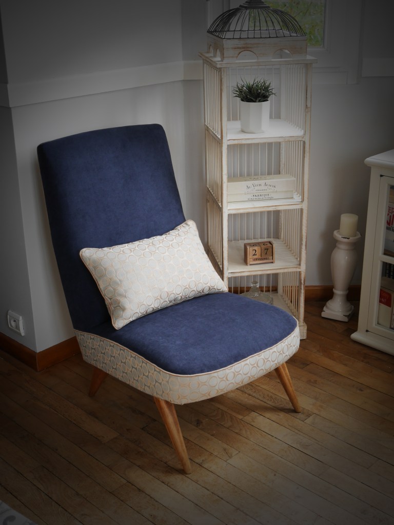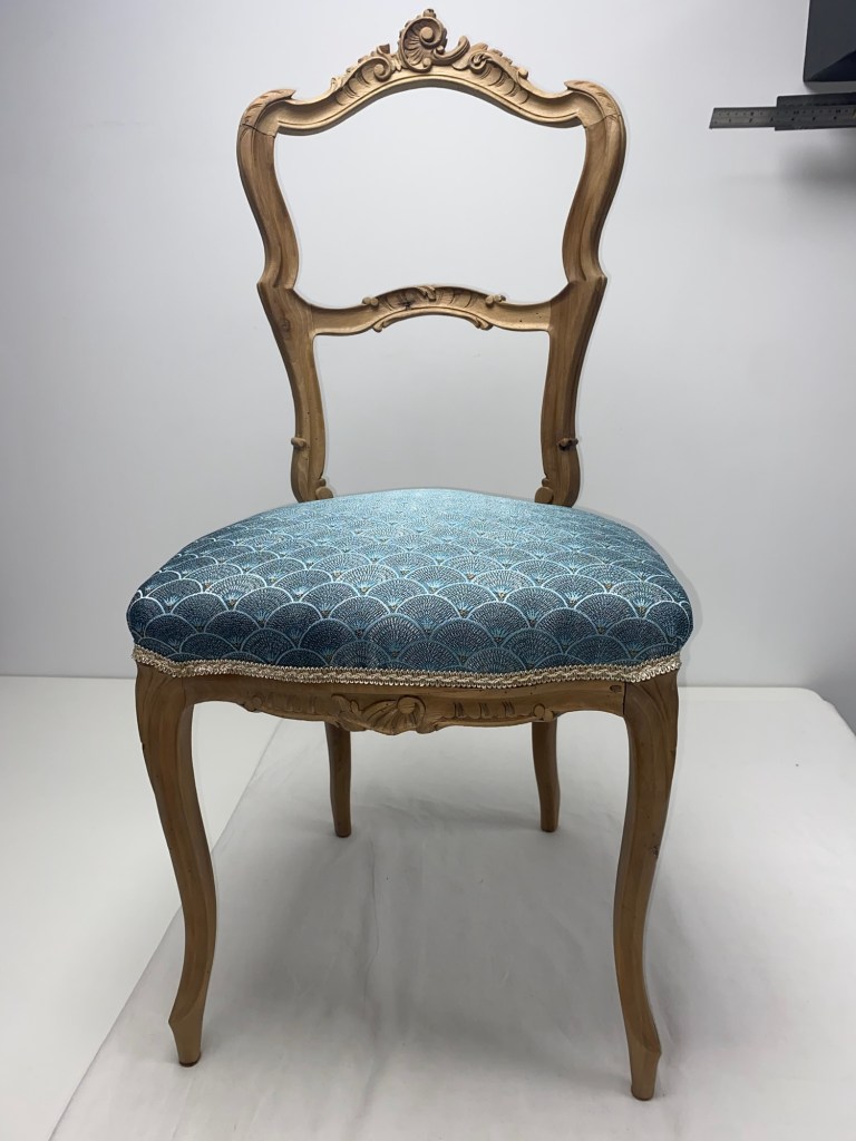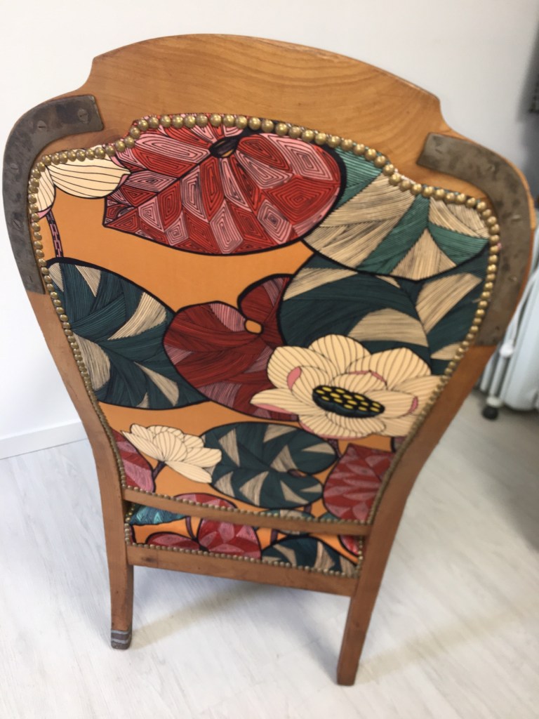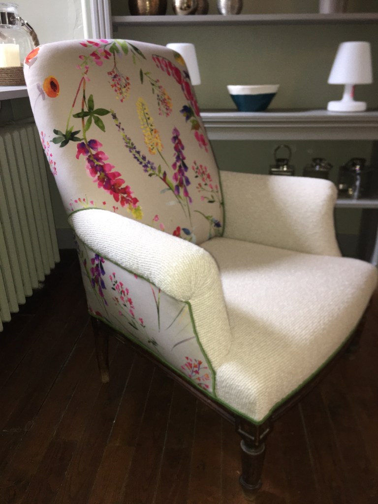 Recouvrage fauteuil cabriolet et repose-pieds, confection de 2 coussins (plumes et kapok) et de 2 housses de coussins à fermeture.Création de toiles de jute personnalisées pour la réalisation manuelle d’un cache radiateur (radiateur en fonte).Changement simili cuir sur des chaises de cuisine.Changement de tissu pour ces deux chaises de style tâchées.Recouvrage d’une chaise.Recouvrage d’un ensemble de 6 chaises (assises, dossiers et dos) en simili cuir bleu et finition dans le simili cuir bleu.Création d’un coussin pour une banquette en bois : en toile de jute à chevrons personnalisée et tissu en velours noir aspect cuir.Recouvrage chaises, tissu fourni par le client et crête Annecy (Les Passementeries de l’Île de France).Reprise recouvrage fauteuil voltaire avec tissu et finition fournis par le client.Restauration assises de chaises en simili cuir.Nouvelle couverture pour ce coussin d’assise. Tissu ivoire à chevrons ton sur ton et bouton recouvert d’un simili cuir camel.Restauration assises de chaises en simili cuir.Réfection tabouret de piano, finition double passepoil avec le tissu fourni.Réfection de 2 cabriolets Louis XV.Restauration fauteuil Voltaire et tabouret de piano avec tissu fourni par le client.Chauffeuse vintage.Fauteuil des années 30.Cabriolet Louis XV avec toile de jute personnalisée.Fauteuil Voltaire.Fauteuils bridge et pouf carré réalisés à partir de carcasses neuves.