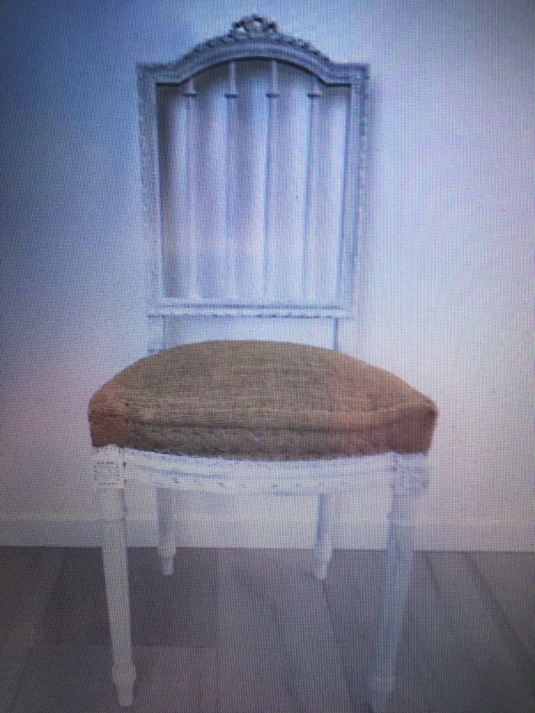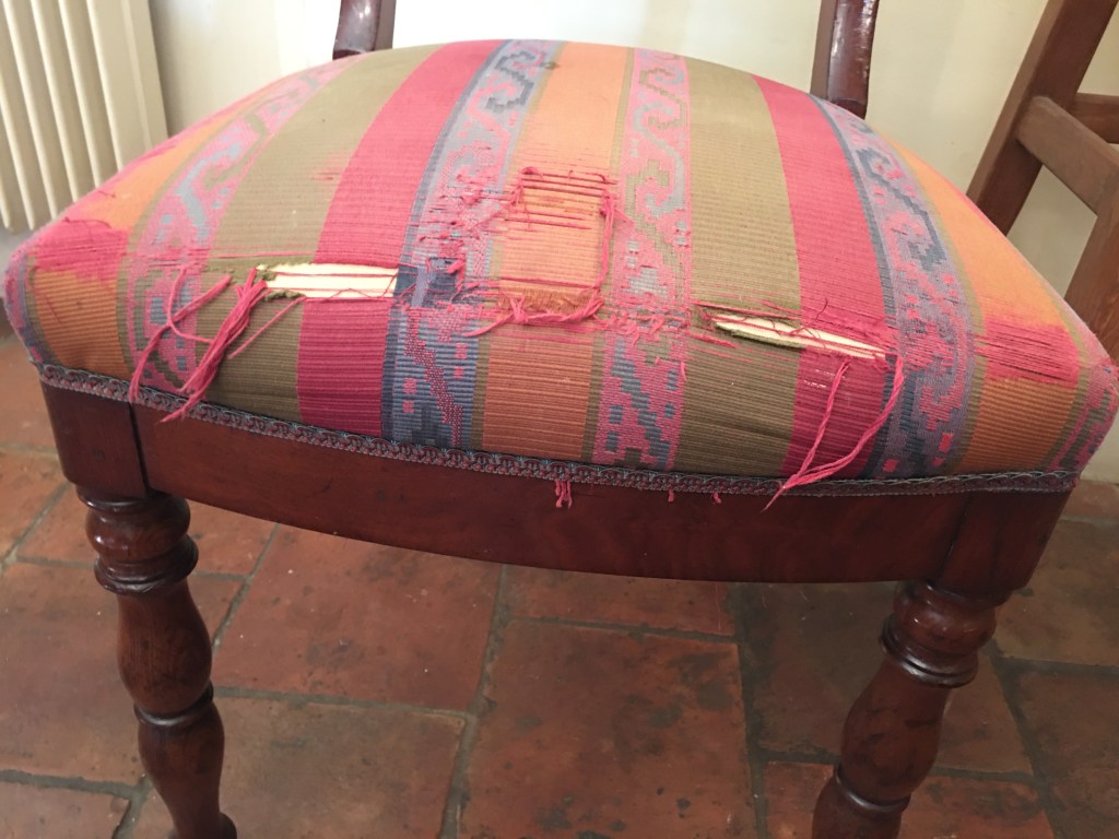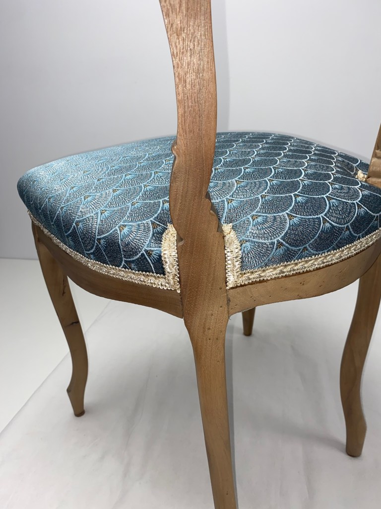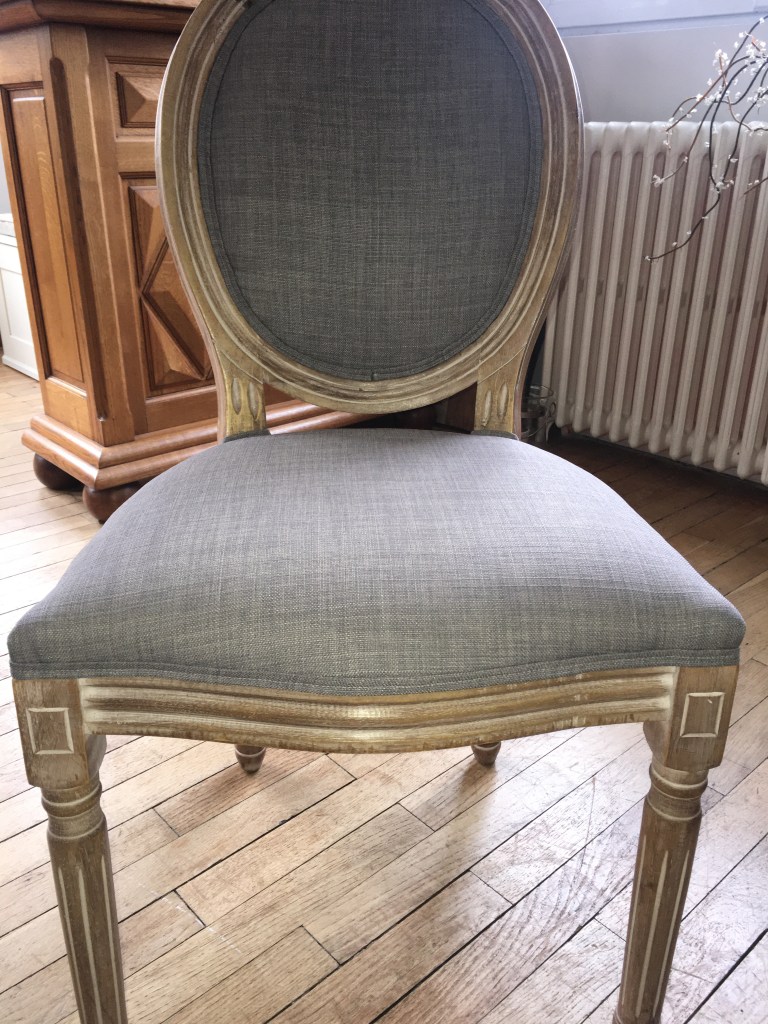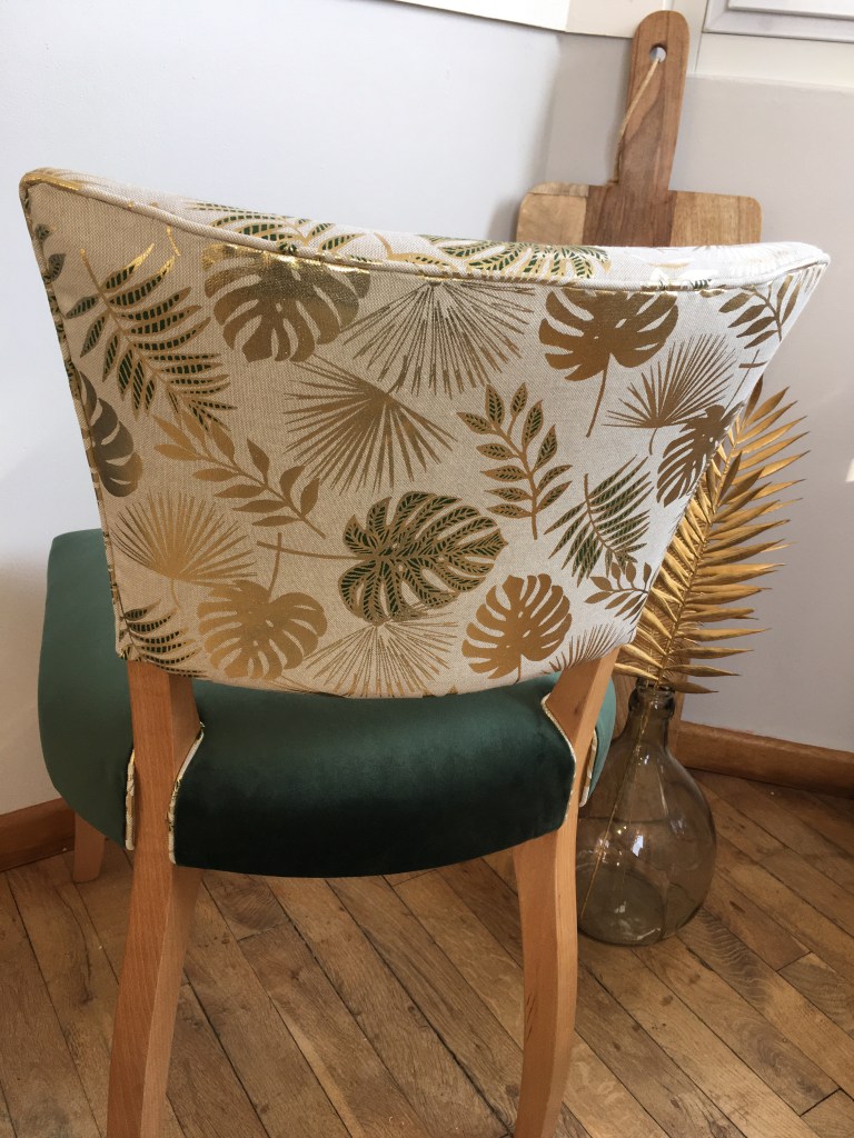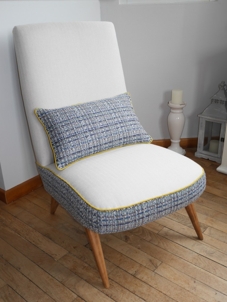 Recouvrage fauteuil cabriolet et repose-pieds, confection de 2 coussins (plumes et kapok) et de 2 housses de coussins à fermeture.Création de toiles de jute personnalisées pour la réalisation manuelle d’un cache radiateur (radiateur en fonte).Changement simili cuir sur des chaises de cuisine.Changement de tissu pour ces deux chaises de style tâchées.Recouvrage d’une chaise.Recouvrage d’un ensemble de 6 chaises (assises, dossiers et dos) en simili cuir bleu et finition dans le simili cuir bleu.Création d’un coussin pour une banquette en bois : en toile de jute à chevrons personnalisée et tissu en velours noir aspect cuir.Recouvrage chaises, tissu fourni par le client et crête Annecy (Les Passementeries de l’Île de France).Reprise recouvrage fauteuil voltaire avec tissu et finition fournis par le client.Restauration assises de chaises en simili cuir.Nouvelle couverture pour ce coussin d’assise. Tissu ivoire à chevrons ton sur ton et bouton recouvert d’un simili cuir camel.Restauration assises de chaises en simili cuir.Réfection tabouret de piano, finition double passepoil avec le tissu fourni.Réfection de 2 cabriolets Louis XV.Restauration fauteuil Voltaire et tabouret de piano avec tissu fourni par le client.Chauffeuse vintage.Fauteuil des années 30.Cabriolet Louis XV avec toile de jute personnalisée.Fauteuil Voltaire.Fauteuils bridge et pouf carré réalisés à partir de carcasses neuves.