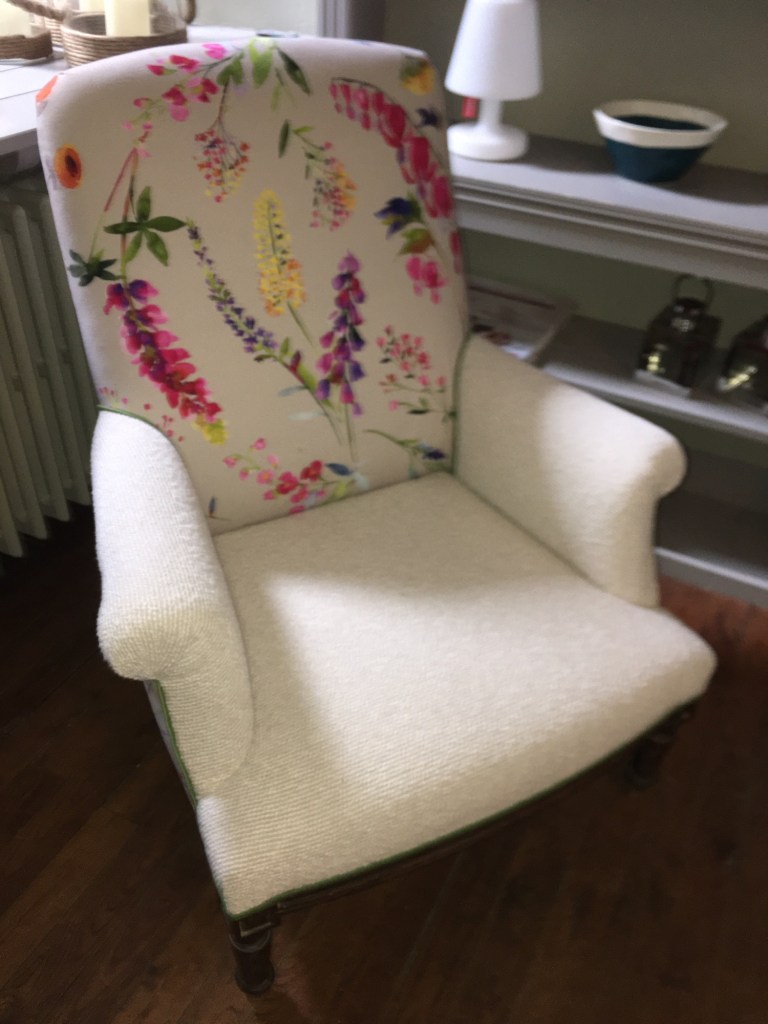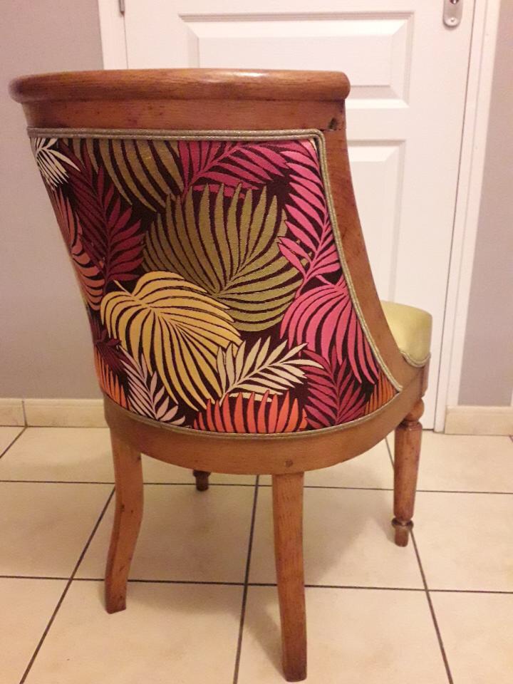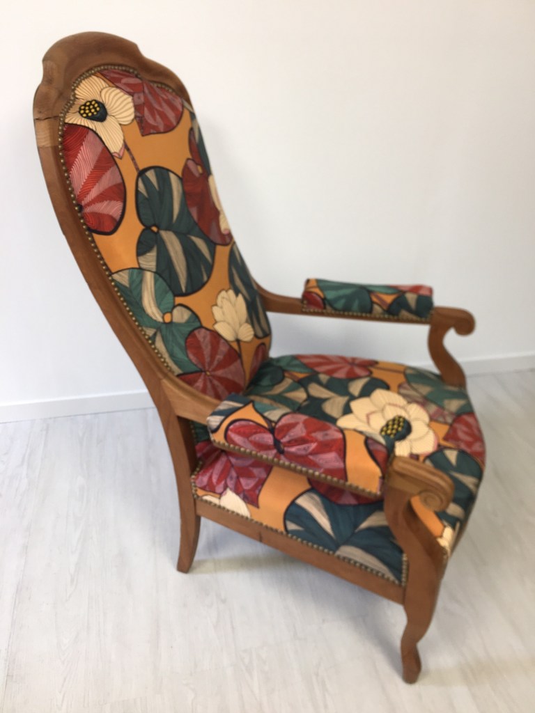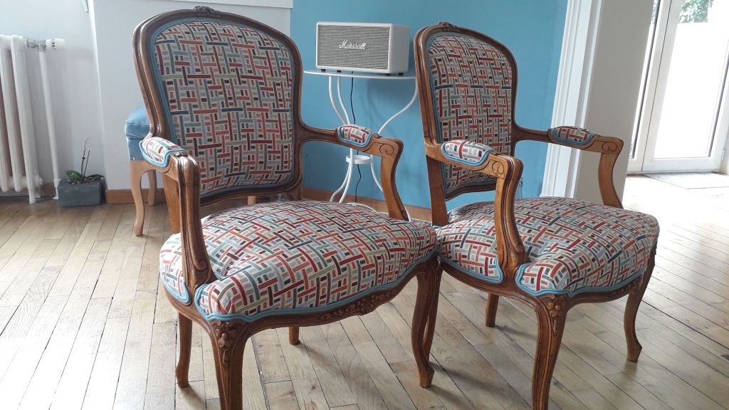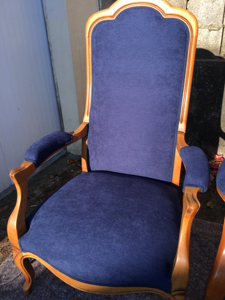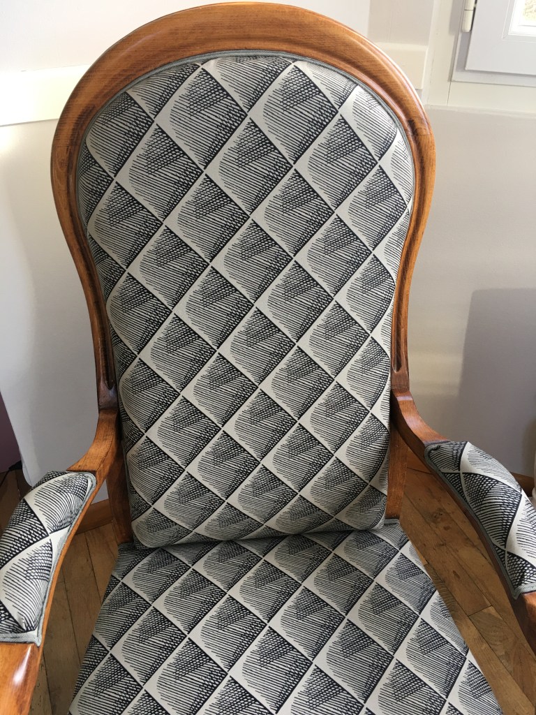 Nouveau simili cuir pour ces 4 assises de chaises de bar.Changement de tissu et réfection d’assise pour ces 2 fauteuils de style Voltaire. Finition et tissu ton sur ton.Changement de tissu (fourni par les clients) pour ces deux fauteuils.Changement de tissu et garnissage partiel pour ce fauteuil inclinable.Nouveau tissu et réfection du dossier pour ce fauteuil.Réfection complète semi-traditionnelle pour cette chaise.Recouvrage pour ce fauteuil, finition confectionnée dans le tissu au dos.Restauration complète fauteuil de style.