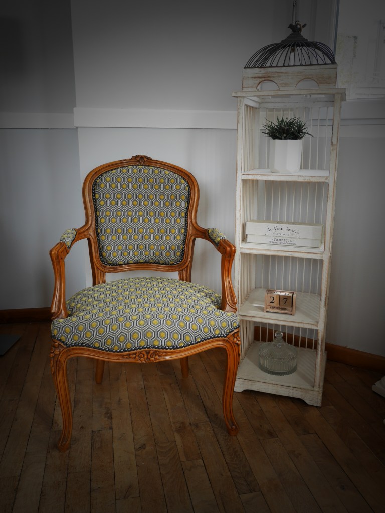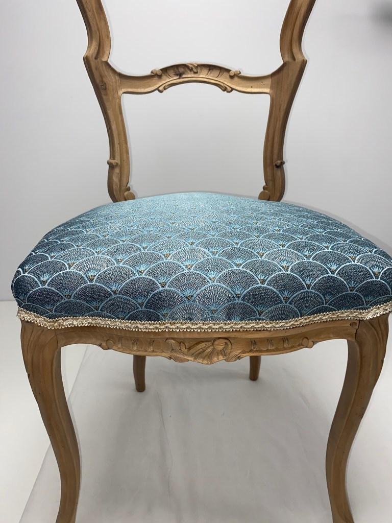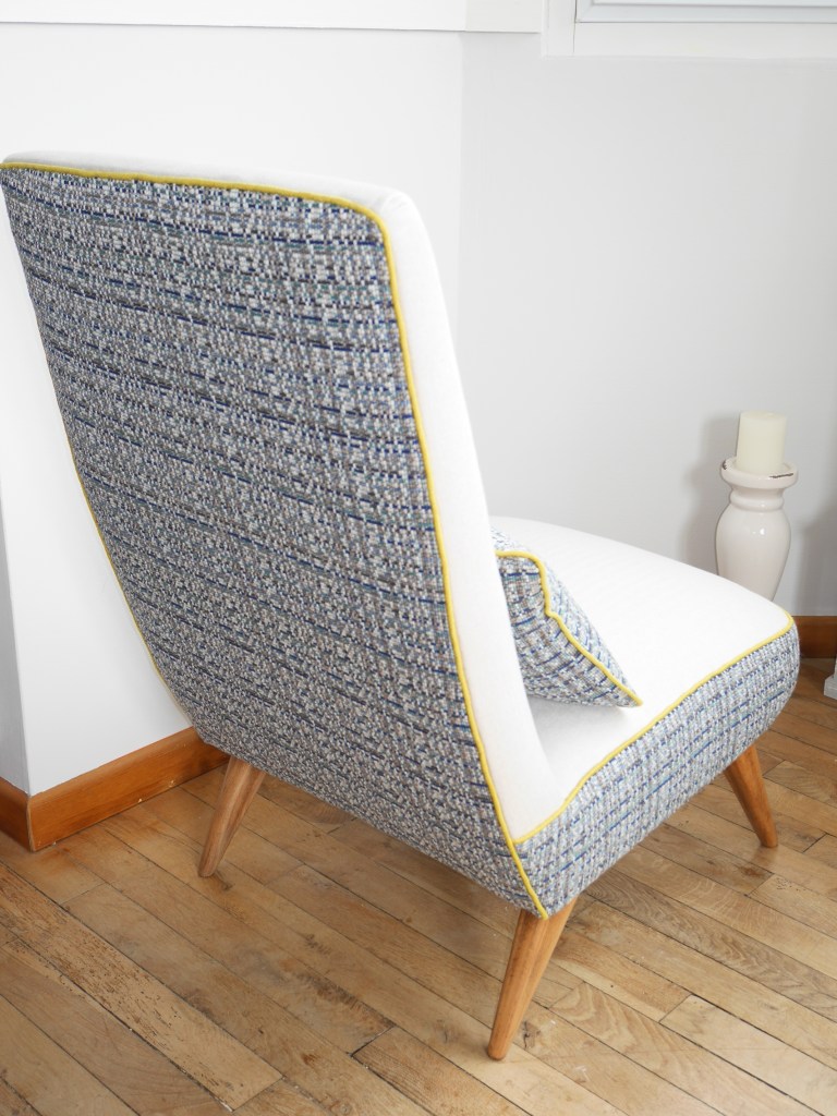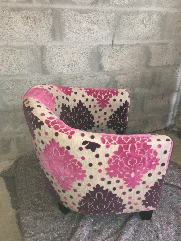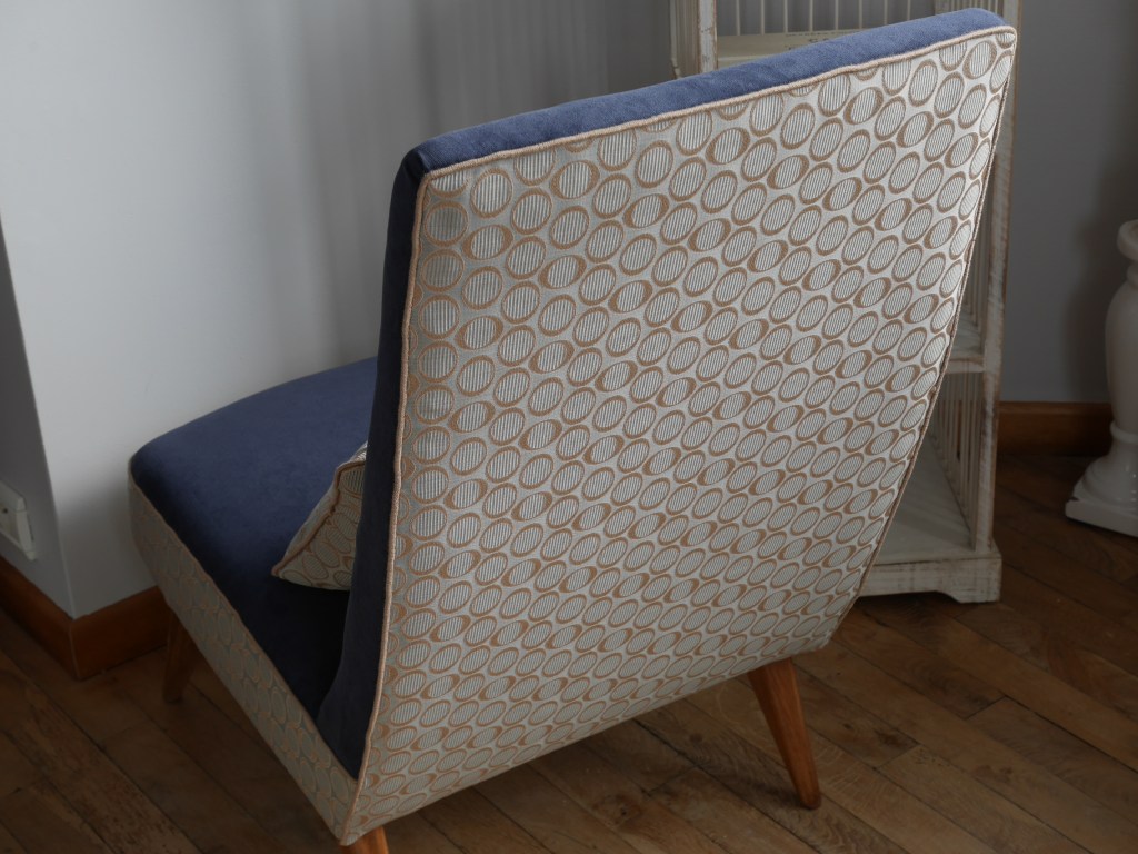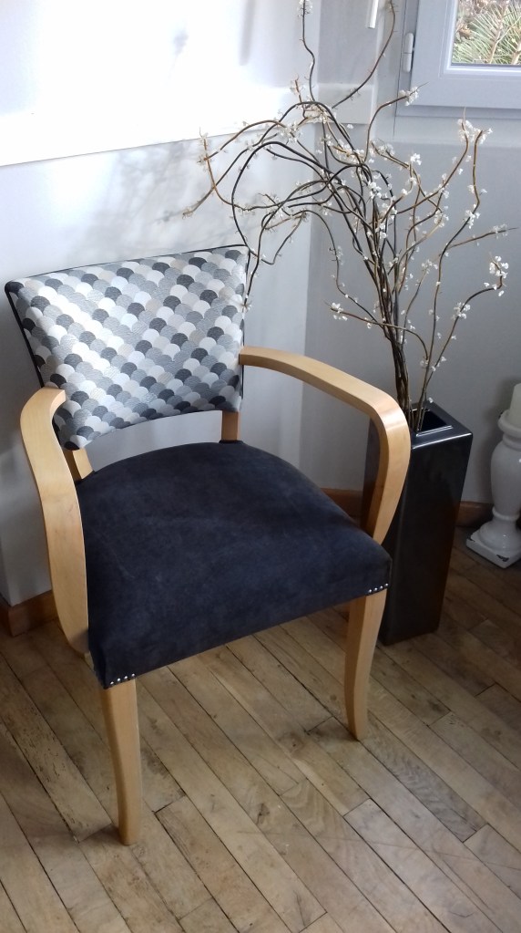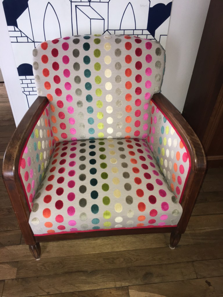 Nouveau simili cuir pour ces 4 assises de chaises de bar.Changement de tissu et réfection d’assise pour ces 2 fauteuils de style Voltaire. Finition et tissu ton sur ton.Changement de tissu (fourni par les clients) pour ces deux fauteuils.Changement de tissu et garnissage partiel pour ce fauteuil inclinable.Nouveau tissu et réfection du dossier pour ce fauteuil.Réfection complète semi-traditionnelle pour cette chaise.Recouvrage pour ce fauteuil, finition confectionnée dans le tissu au dos.Restauration complète fauteuil de style.