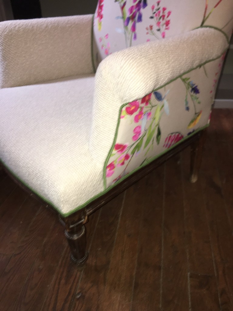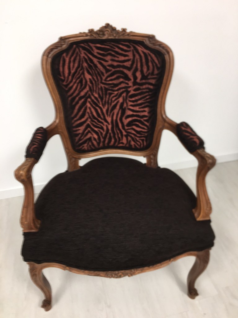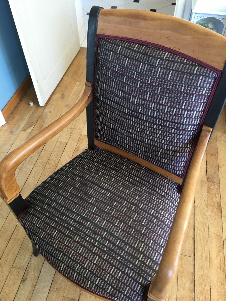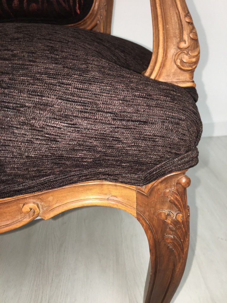 Réfection de l’assise pour ce fauteuil cabriolet. Tissu chenille Froca Esparta brun noir uni pour correspondre aux motifs du tissu inchangé du dossier et fabrication de la finition double passepoil avec le tissu Froca.