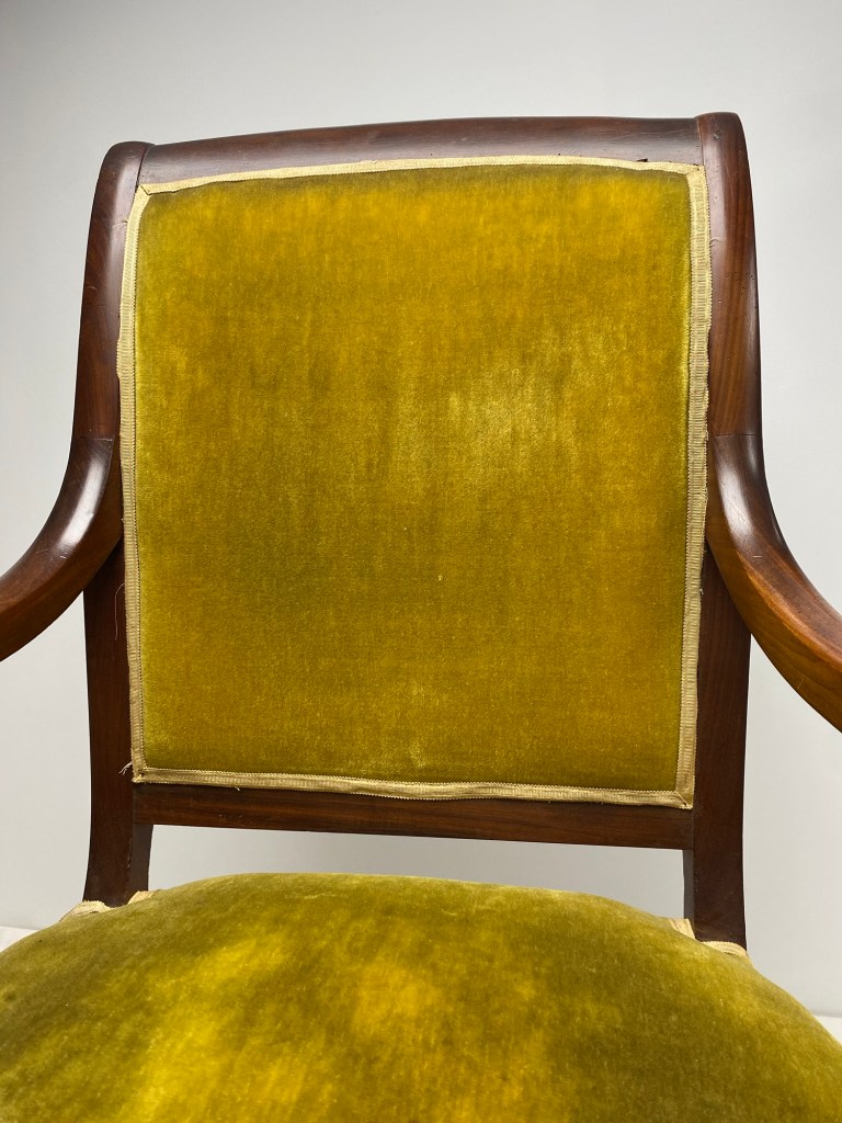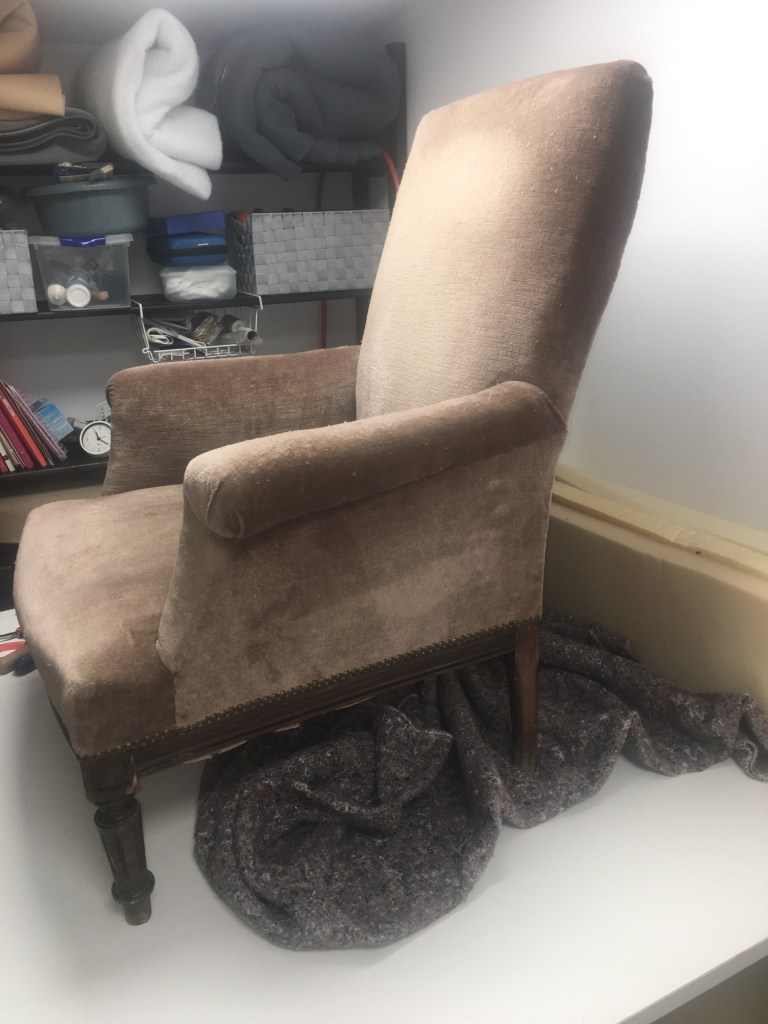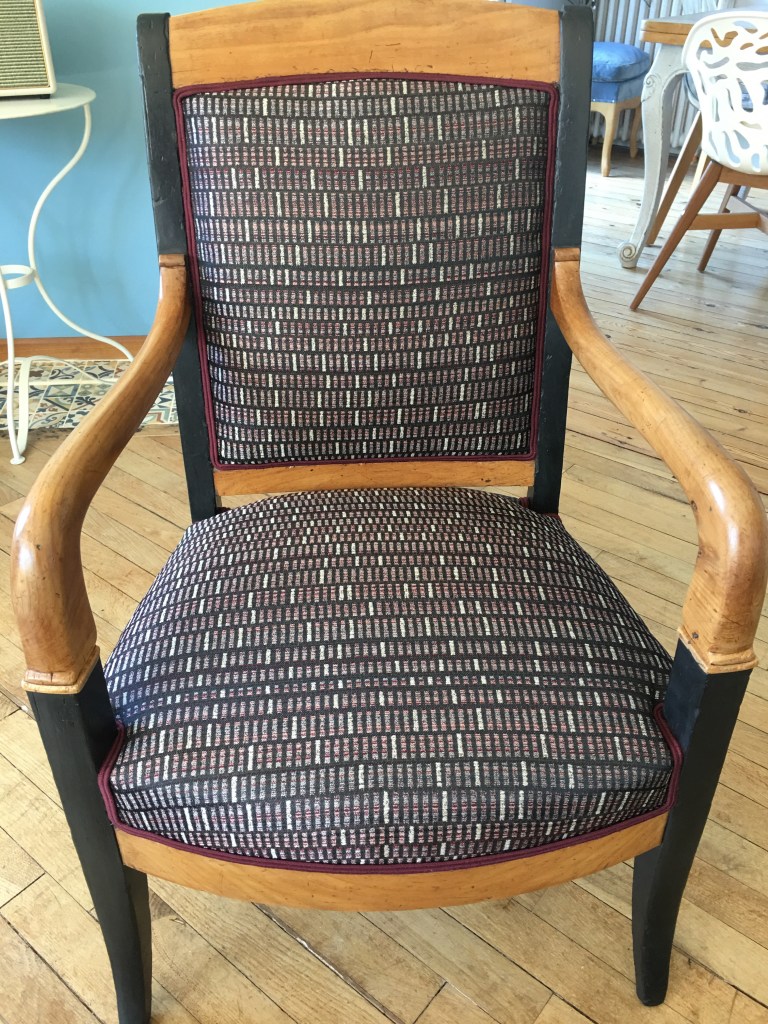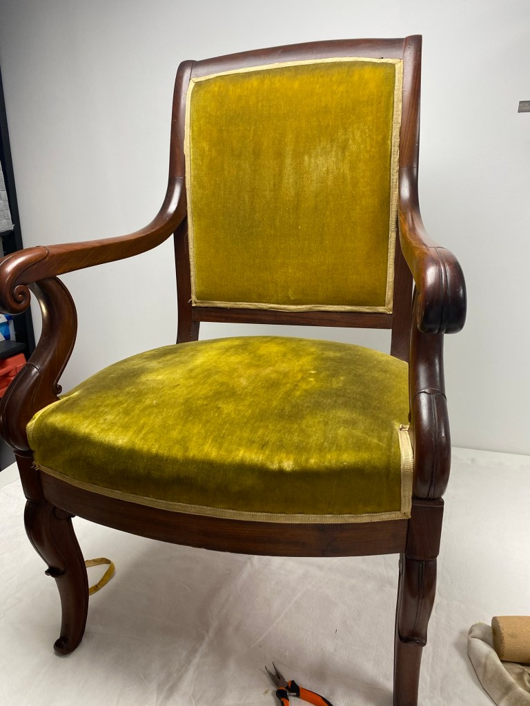 Réfection de l’assise pour ce fauteuil cabriolet. Tissu chenille Froca Esparta brun noir uni pour correspondre aux motifs du tissu inchangé du dossier et fabrication de la finition double passepoil avec le tissu Froca.