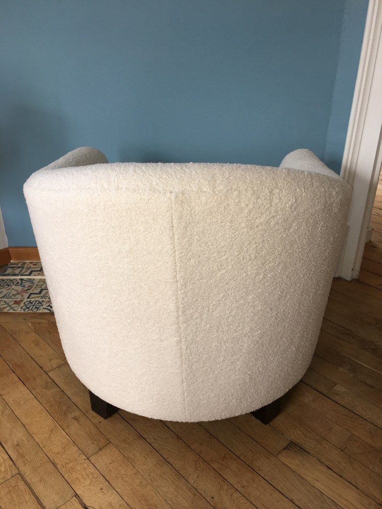 Recouvrage d’un fauteuil type tonneau. Tissu type fourrure de mouton.