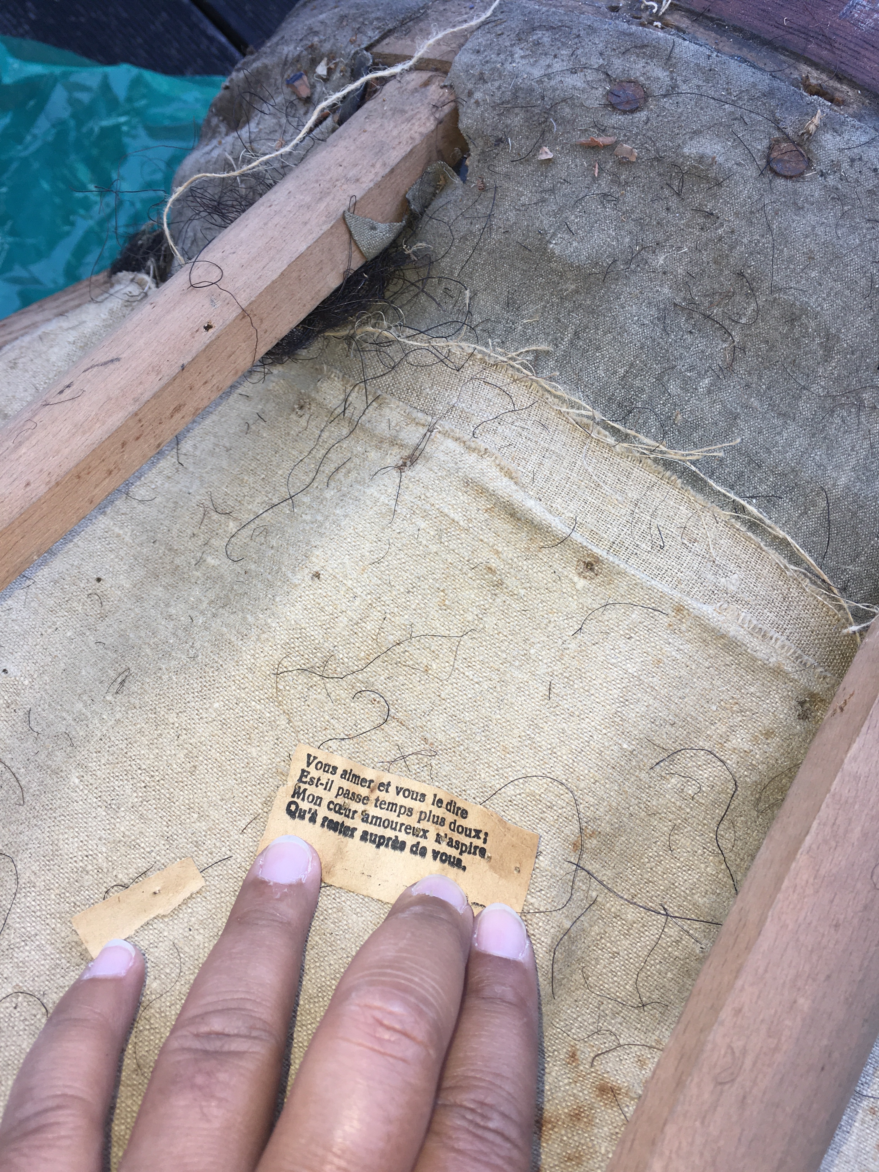 Eh bien non ! Pas de lingots d’or, de billets ou de bijoux… ! mais un petit bout d’histoire retrouvé en dégarnissant un fauteuil.